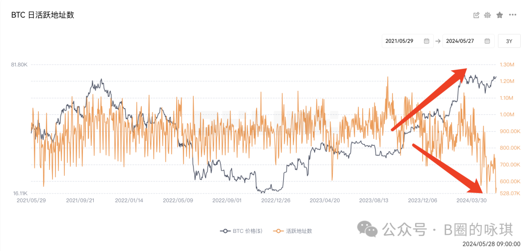 中心化交易所不管是coinbase还是币安,都出现了很明显的比特币被买走了,大家都买了提到钱包不动了,在链上你也能很清晰的看到伴随着比特币价格的上涨,活跃的地址缺在很明显的减少,而且是成反比关系。