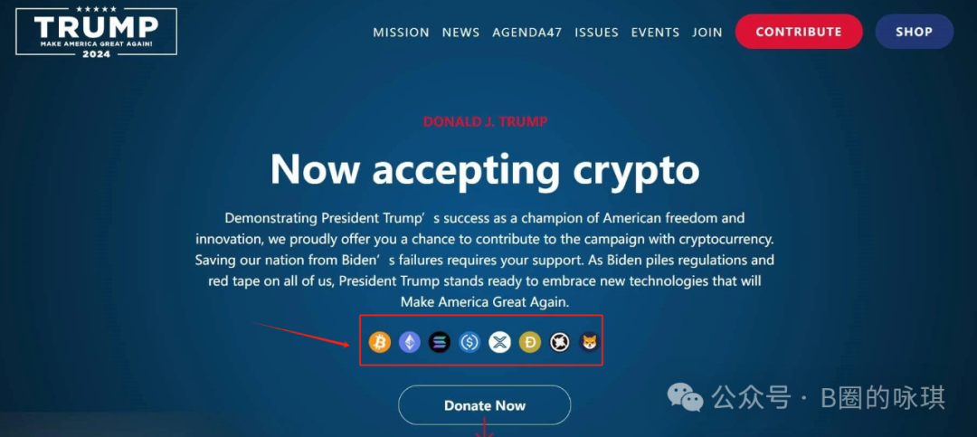 从各大社交媒体上可以看到川普,现在的态度是非常明显,支持加密货币,并且在竞选中特朗普团队接受8种代币的捐赠,分别是:比特币、ETH、Doge、 Shiba Inu、XRP、USDC、SOL和0x (ZRX)