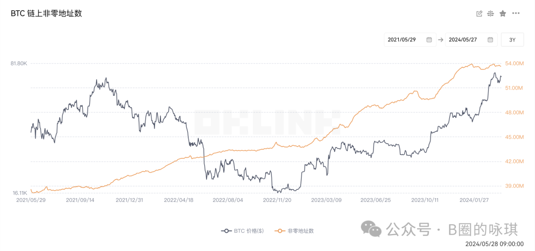 其实在另外一个层面上:比特币非零地址的增加和币价成正线性相关,这也就是你看到的前面交易所的币都被提到这里了。