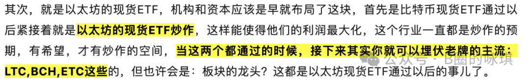 第一:当以太坊现货ETF通过以后意味着会传统老牌的这一批代币,BCH、LTC、ETC、SOL等这一批,会不会被申请通过?当时比特币的现货ETF申请通过以后我在文章中就提到了,接下来的炒作就是以太坊的现货ETF,现在以太坊的现货ETF通过以后,我个人的观点还是不变。