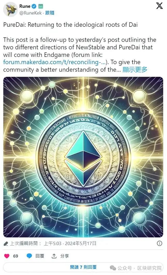 去中心化借贷协议 MakerDAO 创办人 Rune Christensen 继昨日发布关于 Endgame 计划中 NewStable 和 PureDai 两种不同方向的新稳定币计划后,今日在 X 上进一步介绍关于 PureDai 设计和实施的想法和原则。