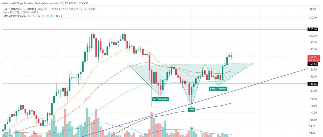 5月的头三周对Solana(SOL)来说特别看涨,其价格从112美元飙升至168美元,增长了50%。这次复苏的显著特点是低点坚决上涨,显示出买家正在市场低位吸纳,标志着市场情绪的变化。上涨的价格还形成了一个倒转的头肩形态,表明Solana已经触底。