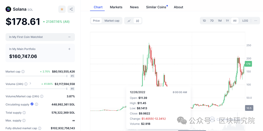 本轮牛市中,SOL生态不断壮大,DePIN、Meme、Defi等生态项目助推Solana从底部的不足9美金,暴涨至当前的178.6美金(截止发稿),市值超800亿美金,跃居至加密货币市场第四位,仅次于 BTC、ETH、BNB。