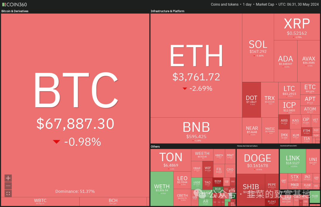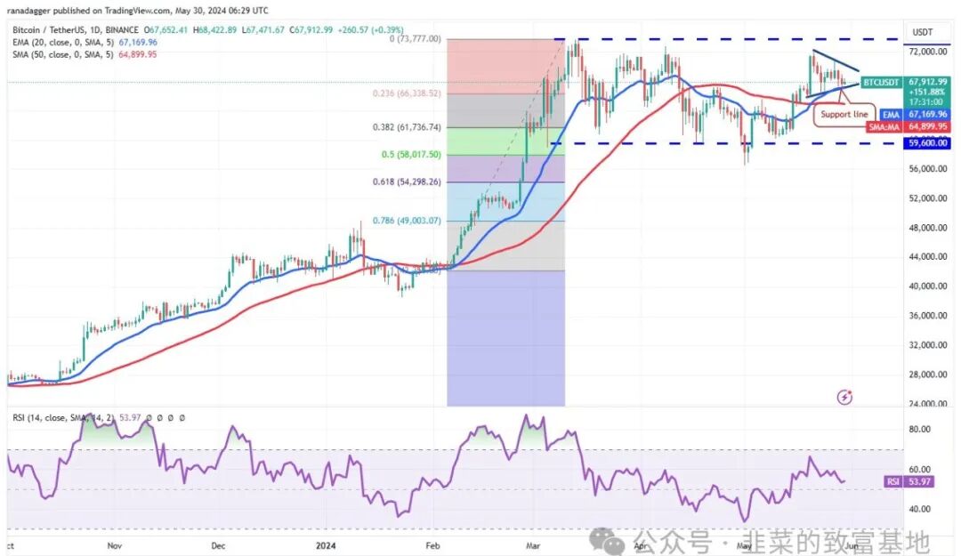 多头未能推动并维持价格在 70,000 美元以上,导致比特币跌至 20 天指数移动平均线(67,169 美元)。
