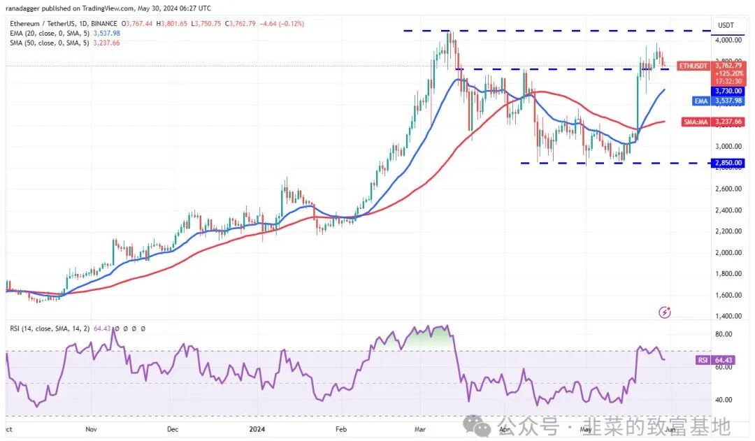 以太坊于 5 月 27 日从 3,977 美元下跌,表明空头正在激烈捍卫 4,000 美元至 4,100 美元的阻力区。
