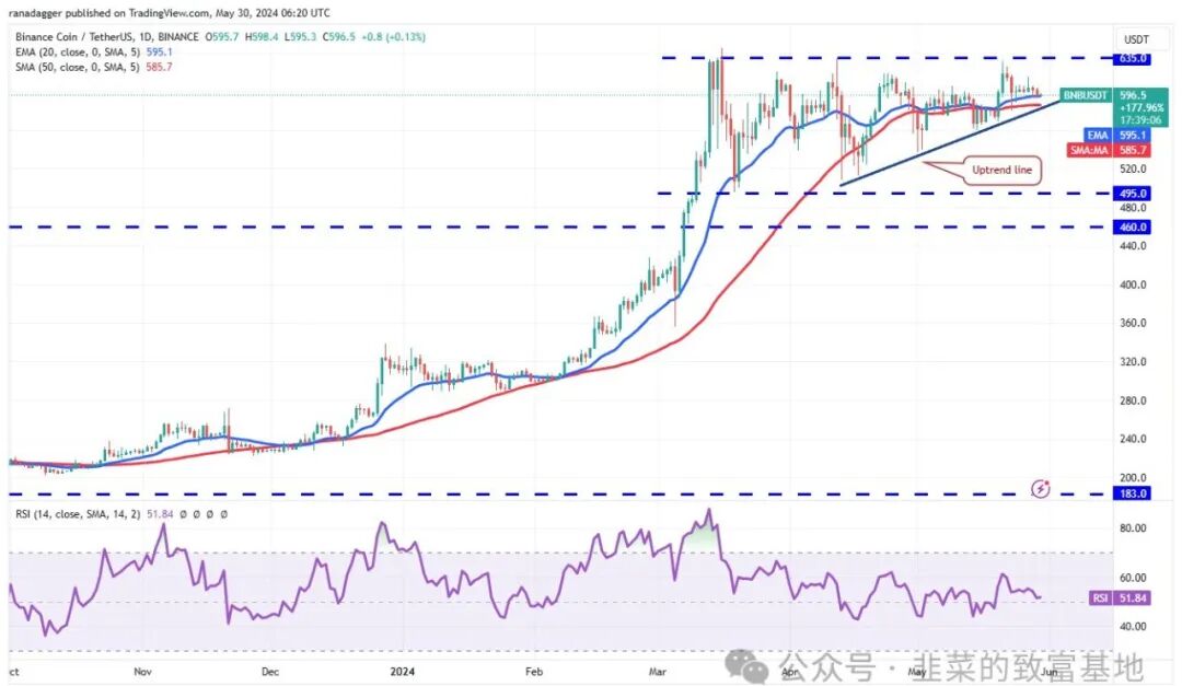 过去几天,多头一直将 BNB(BNB )保持在移动平均线之上,但未能将价格推高至 635 美元的上方阻力位。