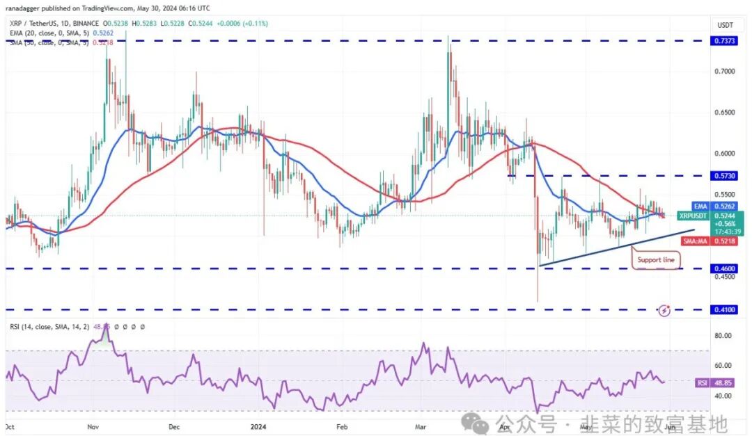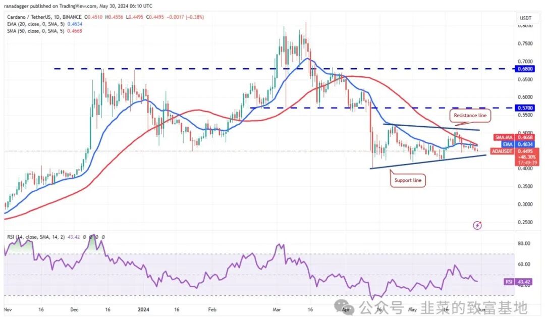 如果ADA/USDT的价格能够成功升至20日均线的上方,多头将会积极寻求将该货币对推向阻力线。一旦价格能够突破阻力线并稳定地收盘在三角形上方,这将预示着ADA/USDT即将开始一个强劲的复苏阶段。在此情况下,该货币对有望攀升至0.57美元的水平,进而有可能进一步上涨至0.63美元。