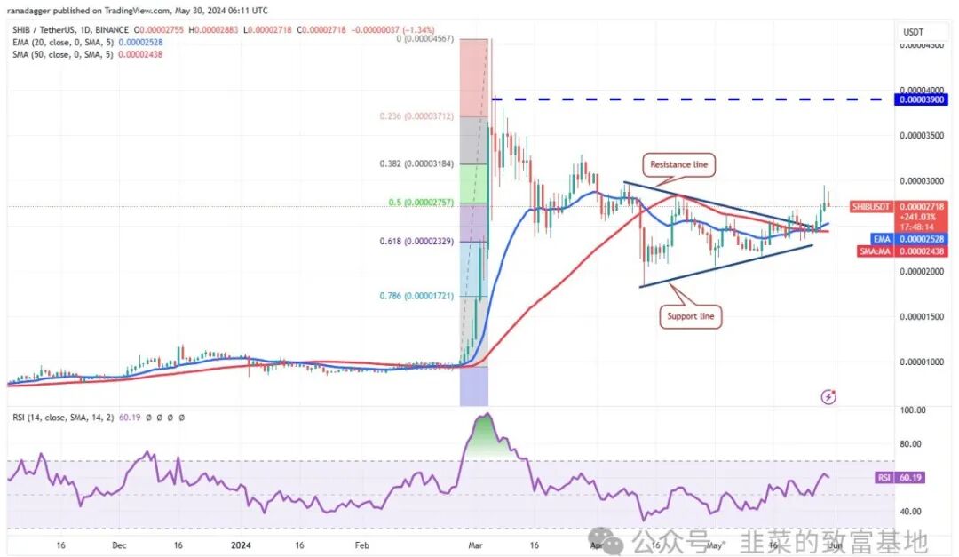 5 月 27 日,柴犬飙升至对称三角形模式上方,表明不确定性已经解决,有利于多头。