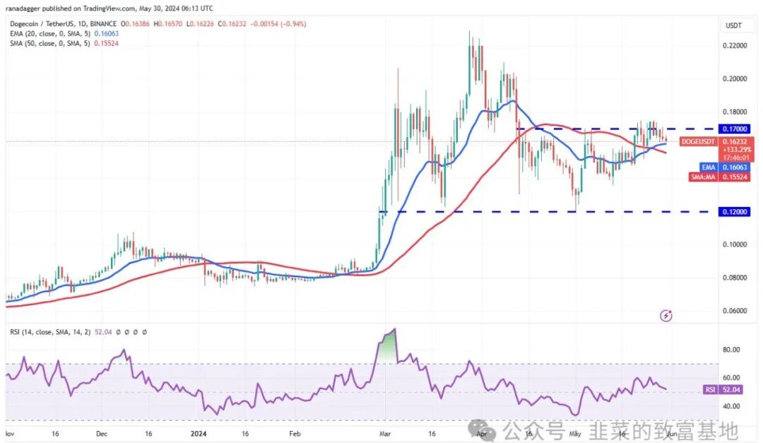 多头不允许狗狗币跌破 20 天 EMA(0.16 美元),表明逢低买入。