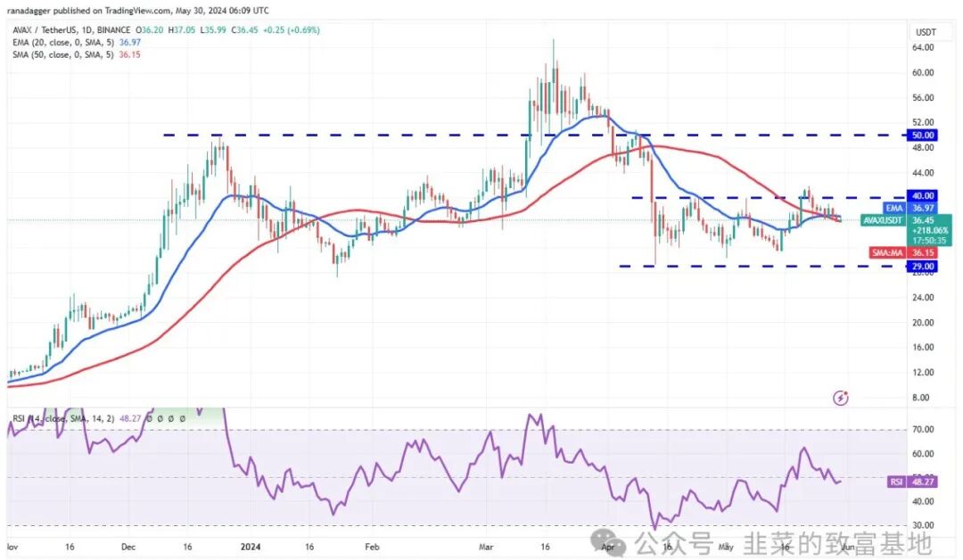 然而,如果价格跌破这一移动平均线,空头将尝试将AVAX/USDT货币对拉低至29美元。如果价格能从这一支撑位强势反弹,那么这可能表明该货币对将在一个相对稳定的29美元至40美元的区间内波动一段时间。