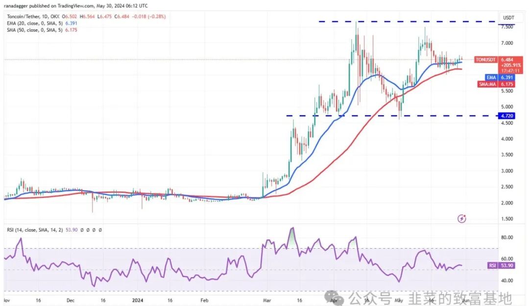 若买家能够将价格推高并维持在6.73美元之上,他们将在市场中占据优势地位。如果买家成功做到这一点,TON/USDT货币对可能会开始反弹,目标上方阻力位7.67美元。这个价位对于空头来说是重要的防线,因为一旦价格突破该水平,这将预示着上升趋势的重新确立。