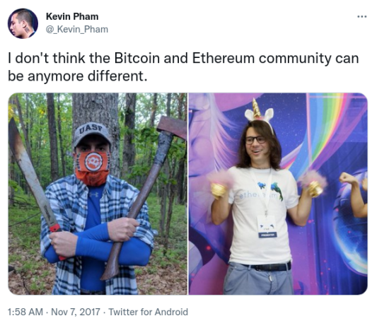 Kevin Pham 在一条旧推文中比较了 Bitcoin 和以太坊文化在 2017 年的情况。这两种文化都在继续发展:自 2017 年以来,我们看到了「激光眼」运动的兴衰(同时也看到了 Ordinals 等运动的兴起),以太坊变得以 L2 为中心,这两种文化都变得更加主流。但二者仍然存在差异,保持这种差异也许是最好的。