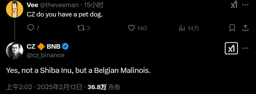 2 月 13 日凌晨,Twitter 平台用户 @theveeman 在评论区询问 CZ 是否有宠物狗,CZ 回复称自己饲养的是「比利时马犬(Belgian Malinois)」而非柴犬。
