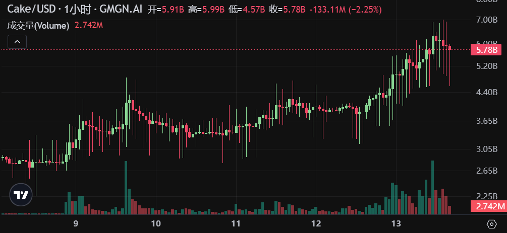 PancakeSwap 是 BNB Chain 上最受欢迎的 AMM 协议之一,也是整个 DeFi 行业中广泛使用的 DEX,CAKE 是 PancakeSwap 平台的原生代币。PancakeSwap 具有低交易费用(0.2% 的交易费)和丰富的功能(如 farm、彩票、NFT 市场等),交易量与用户活跃度持续领先。13 日午间,Cake 市值最高达到 70 亿美元,截至撰稿,24h 涨幅达 38%。