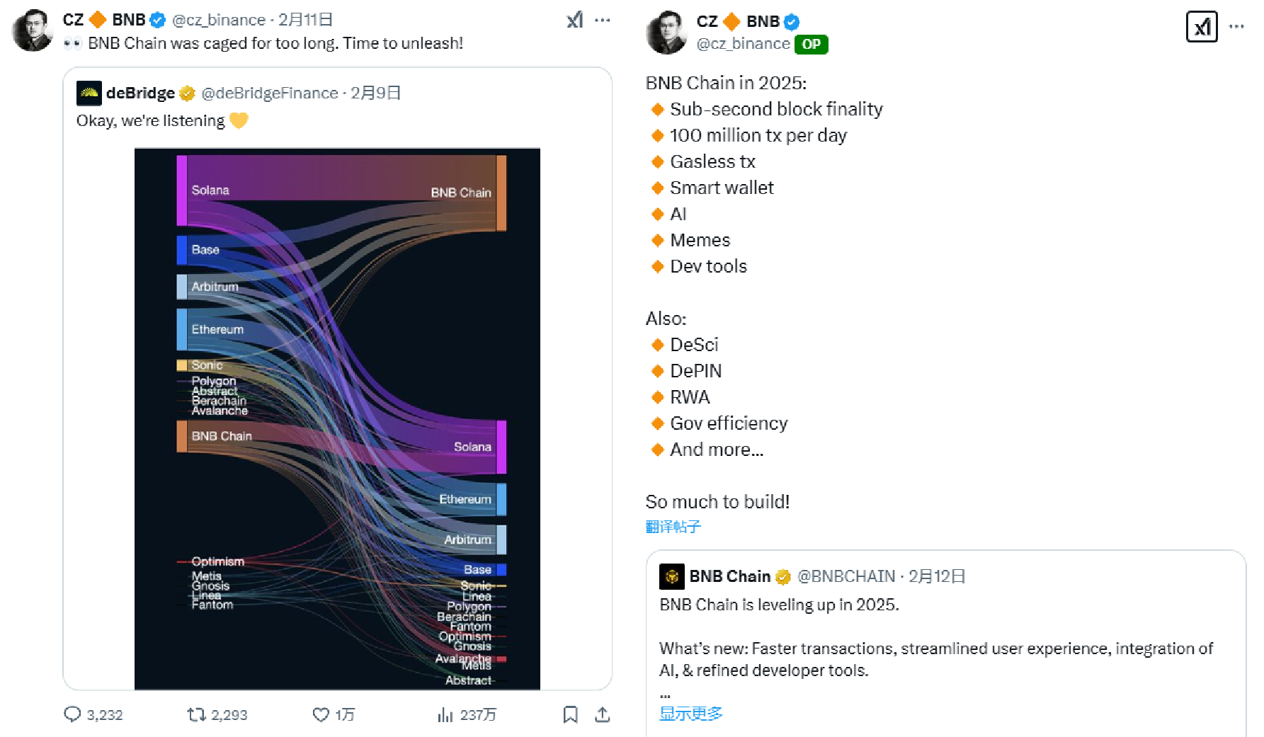 有了 TST 带动 BNB Chain 的活跃作为铺垫,2 月 11 日,CZ 在推特上宣布「BNB Chain 被禁锢太久,是时候解开束缚了」,12 日又发布了 2025 年 BNB Chain build 的目标领域,引发市场对生态升级的强烈预期。11 日,BNB 突破 640 美元,24 小时涨幅达 5.75%,今日最高价达到 725 美元,市场热度显著回升。