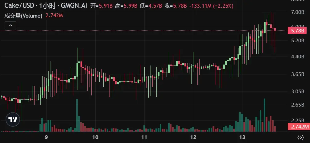 PancakeSwap 是 BNB Chain 上最受欢迎的 AMM 协议之一,也是整个 DeFi 行业中广泛使用的 DEX,CAKE 是 PancakeSwap 平台的原生代币。PancakeSwap 具有低交易费用(0.2% 的交易费)和丰富的功能(如 farm、彩票、NFT 市场等),交易量与用户活跃度持续领先。13 日午间,Cake 市值最高达到 70 亿美元,截至撰稿,24h 涨幅达 38%。