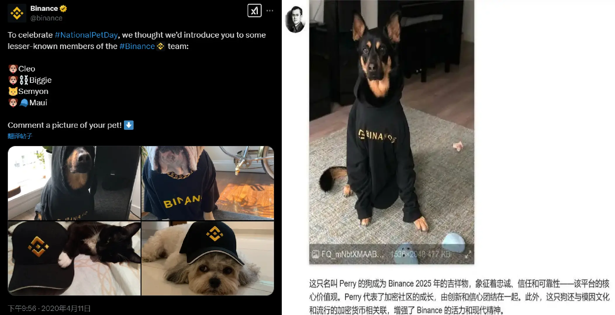为了扒出狗狗的真实信息,网友们展开了一场「地毯式搜索」。有人找到了 2020 年 Binance 官方层曾发过的三只狗狗和一只猫咪,是币安成员们的宠物,有人猜测其中一只可能是 CZ 的。也有人制作了一张穿着 Binance 衣服的狗狗 Perry,并配文暗示其与 Binance 关系匪浅,很有可能是 CZ 的狗...... 直到现在,仍有层出不穷的号称是「CZ's dog」的 meme 币在不断发行,部分 meme 币市值短时突破百万美元。