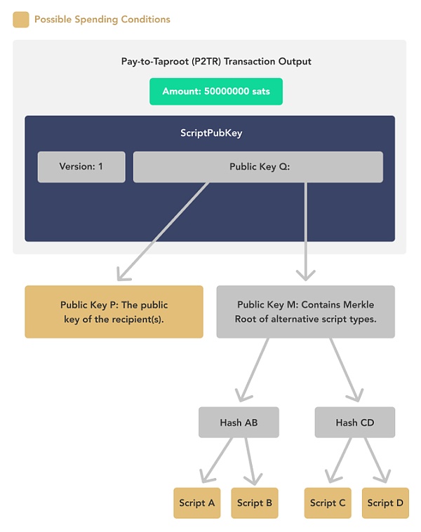 2021年的Taproot协议升级为比特币网络带来了简单的智能合约功能,比如P2TR格式的钱包地址能够通过Bitscript实现一些较为复杂的逻辑,让新的、复杂的交易类型在链上成为可能。Taproot升级的示意如下图: