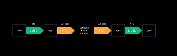 如下图所示,通过Taproot Assets协议发行了稳定币资产L-USD,Alice将价值$10的L-USD通过闪电网络转给了Zane。