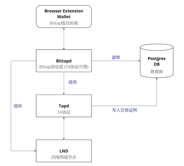 Bittapd协议相当于是TA协议的去中心化代理,它将Tapd原生的中心化托管式账户体系变成了去中心化的解决方案;也充当了插件钱包用户在交易请求时的网络通信和转发任务的角色。